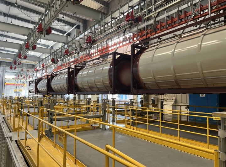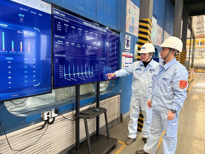 尊龙凯时标罐车间内,,,,,生产执行系统(MES)的使用,,,,,让治理者越发精准把控生产进度节点;;; ;;去年投入运营的喷粉车间,,,,,较以往用工镌汰了60%以上、生产效率提高了40%以上,,,,,事情职员通过中控室的数字大屏,,,,,可随时相识车间生产运营、产量进度以及能耗管控等情形……